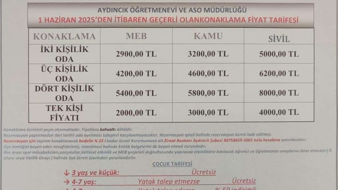 1 HAZİRAN 2025'TEN GEÇERLİ KONAKLAMA FİYATLARI